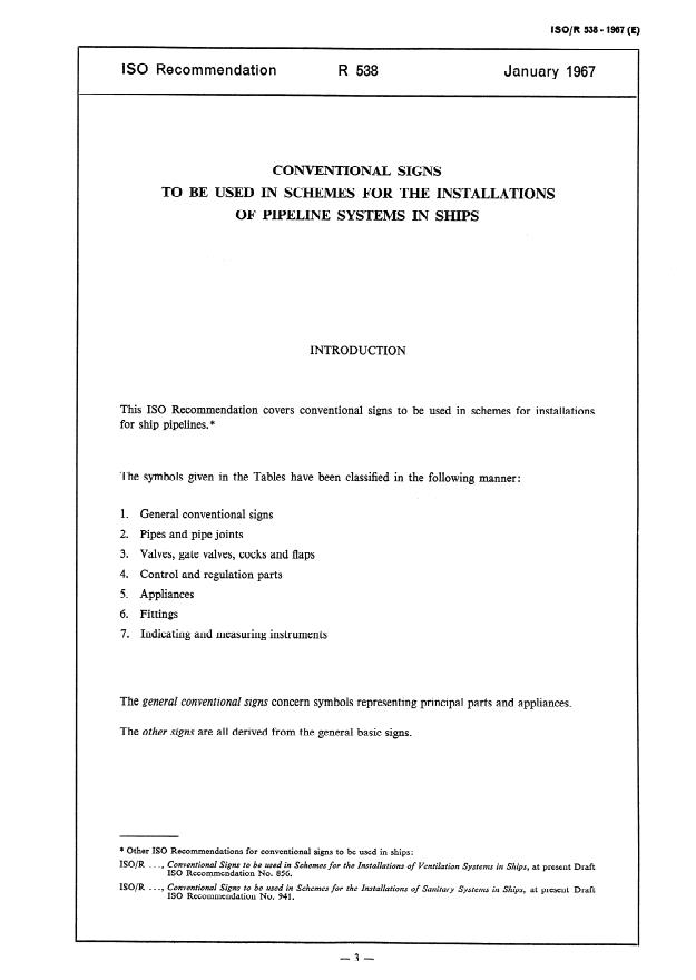 ISO/R 538:1967 - Conventional signs to be used in the schemes for the installations of pipeline systems in ships
