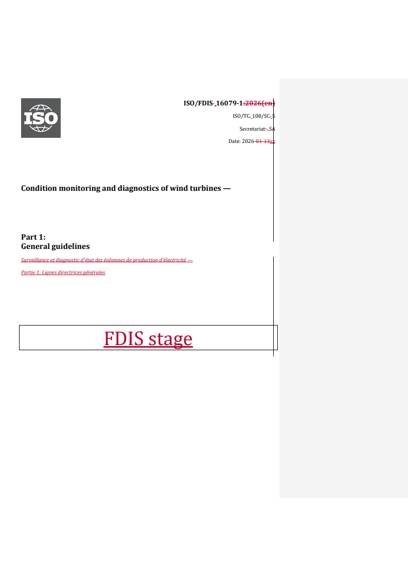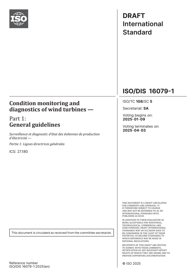 ISO/FDIS 16079-1 - Condition monitoring and diagnostics of wind turbines — Part 1: General guidelines/14/2024