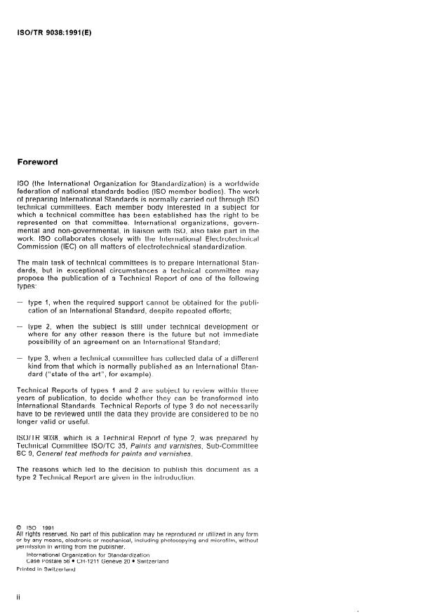 ISO/TR 9038:1991 is a technical report published by the International Organization for Standardization (ISO). Its full title is "Paints and varnishes — Determination of the ability of liquid paints to sustain combustion". This standard covers: Describes a pass/fail procedure for use with paint and related products to determine whether or not a product has the ability to sustain combustion under specified conditions.