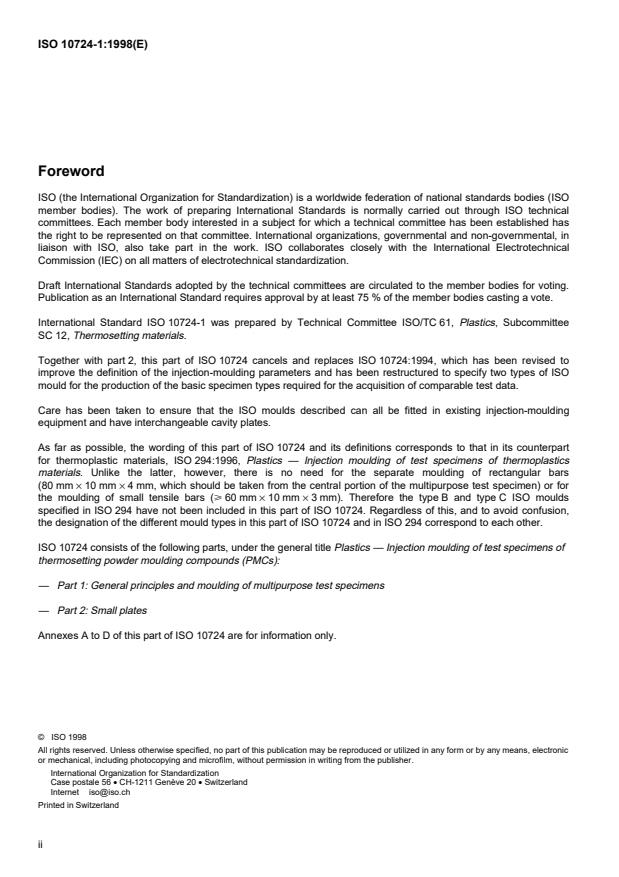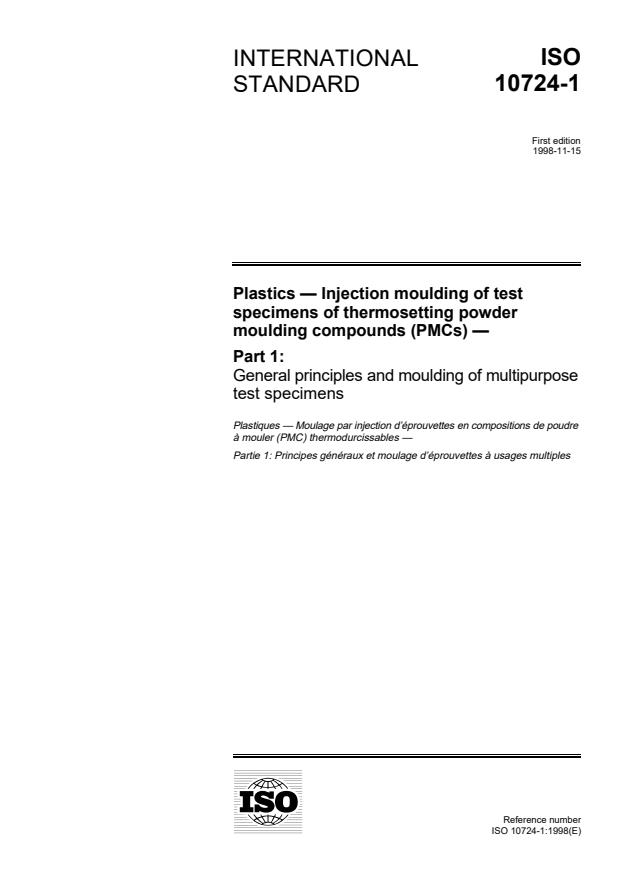 ISO 10724-1:1998 - Plastics -- Injection moulding of test specimens of thermosetting powder moulding compounds (PMCs)