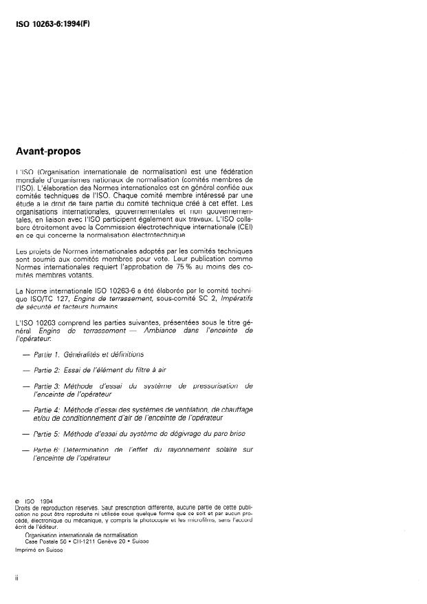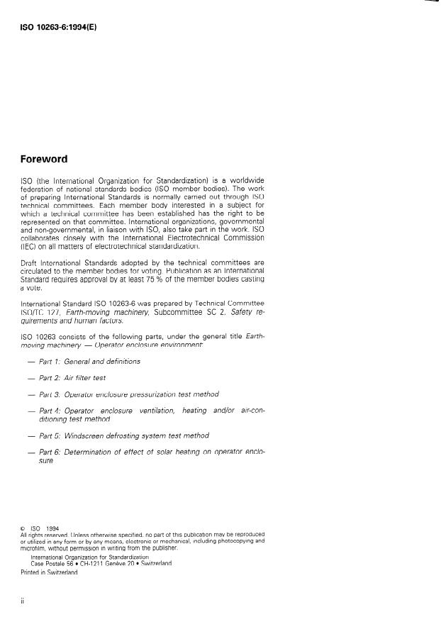 ISO 10263-6:1994 is a standard published by the International Organization for Standardization (ISO). Its full title is "Earth-moving machinery — Operator enclosure environment — Part 6: Determination of effect of solar heating on operator enclosure". This standard covers: Specifies a test method for applying a simulated solar load in the laboratory and determining the radiant heat energy by artificial light source or a natural solar load which affects an operator enclosure of an earth-moving machine. Allows the radiant energy affecting an operator enclosure to be determined during the tests specified in ISO 10263-4.