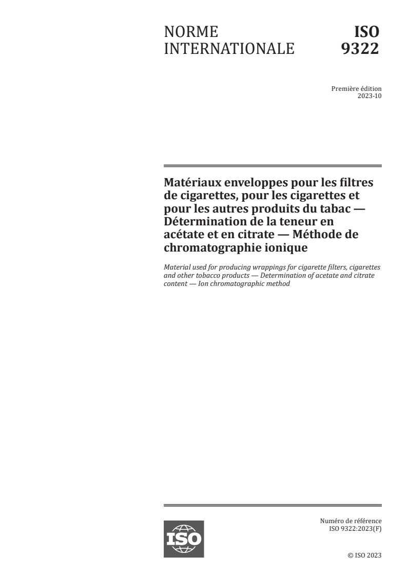 ISO 9322:2023 is a standard published by the International Organization for Standardization (ISO). Its full title is "Material used for producing wrappings for cigarette filters, cigarettes and other tobacco products — Determination of acetate and citrate content — Ion chromatographic method". This standard covers: This document specifies an ion chromatographic method for the determination of the acetate and citrate content of materials used to produce wrappings for cigarette filters, cigarettes, and other tobacco products.