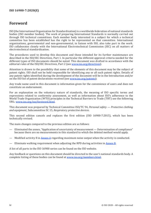 ISO 16900-7:2020 is a standard published by the International Organization for Standardization (ISO). Its full title is "Respiratory protective devices — Methods of test and test equipment — Part 7: Practical performance test methods". This standard covers: This document specifies practical performance tests for respiratory protective devices. The purpose of these tests is to subjectively assess certain properties, characteristics and functions of the RPD, when worn by test subjects in simulated practical use, which cannot be assessed by tests described in other standards.