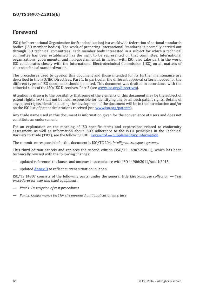 ISO/TS 14907-2:2016 is a technical specification published by the International Organization for Standardization (ISO). Its full title is "Electronic fee collection — Test procedures for user and fixed equipment — Part 2: Conformance test for the on-board unit application interface". This standard covers: ISO/TS 14907-2:2016 describes tests that verify on-board unit (OBU) conformance of implementations of functions and data structures, as defined in the implementation conformance statement based on ISO 14906:2011/Amd1:2015, for electronic fee collection (EFC) applications. After the tests of isolated data items and functions (C.2 to C.4), an example is given for testing of a complete EFC transaction (C.3). It comprises definitions of OBU conformance assessment tests of - basic dedicated short-range communication (DSRC) L7 functionality, - EFC application functions, - EFC attributes (i.e. EFC application information), - the addressing procedures of EFC attributes and (hardware) components [e.g. integrated circuit cards (ICC) and man-machine interfaces (MMI)], - the EFC transaction model, which defines the common elements and steps of any EFC transaction, and - the behaviour of the interface so as to support interoperability on an EFC-DSRC application interface level. The purpose of this part of ISO/TS 14907 is to define tests that - assess OBU capabilities, - assess OBU behaviour, - serve as a guide for OBU conformance evaluation and type approval, - achieve comparability between the results of the corresponding tests applied in different places at different times, and - facilitate communications between parties. Whereas, ISO/TS 14907-2:2016 defines examples of test cases for DSRC and EFC functionality in Annex C, it does not intend to specify a complete test suite for a certain implementation. To compose a test suite for a specific EFC implementation, the test cases may have to be modified and new test cases may have to be defined and added in order for the conformance test to be complete. It can be useful to take into account the following considerations when defining a complete test suite: - small range: "exhaustive testing" of critical interoperability/compatibility features, - large range: testing of boundaries and random values, and - composite types: testing of individual items in sequence or parallel. It is outside the scope of ISO/TS 14907-2:2016 to define tests that assess - performance, - robustness, and - reliability of an implementation. Annex D provides an informative overview of Japanese OBE conformance tests that are based on the ISO/TS 14907 series, in order to illustrate how these can be applied in practice.
