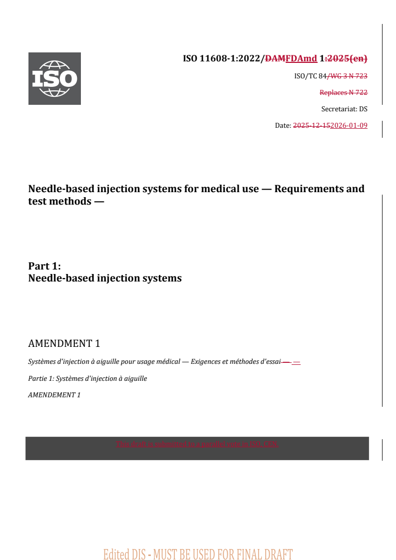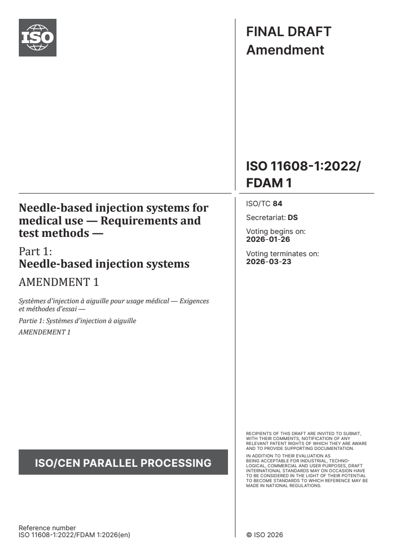 ISO 11608-1:2022/FDAmd 1 - Needle-based injection systems for medical use — Requirements and test methods — Part 1: Needle-based injection systems — Amendment 1 Released:12. 01. 2026