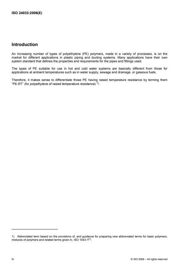 ISO 24033:2006 is a standard published by the International Organization for Standardization (ISO). Its full title is "Pipes made of raised-temperature-resistance polyethylene (PE-RT) — Effect of time and temperature on the expected strength". This standard covers: ISO 24033:2006 lays down the minimum values for expected strength as a function of time and temperature in the form of reference lines, for use in calculations on polyethylene of raised temperature resistance (PE-RT) pipes.