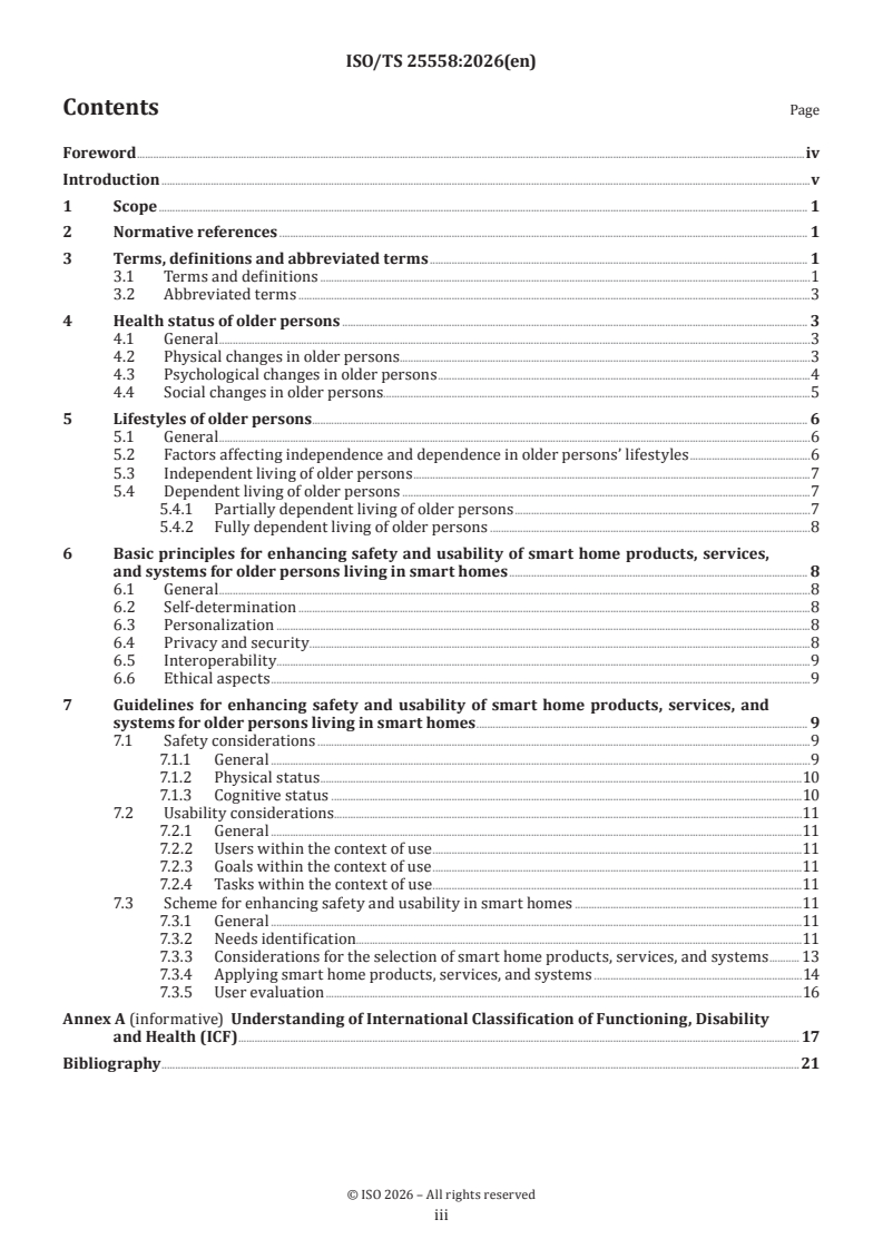 ISO/TS 25558:2026 is a technical specification published by the International Organization for Standardization (ISO). Its full title is "Ageing societies — Guidance for enhancing safety and usability of smart home products, services, and systems for older persons in smart home environment". This standard covers: This document provides guidance for enhancing safety and usability aspects of smart home products, services, and systems to enable older persons to live the healthy lives they desire. It presents a process to assess the needs of older persons who use smart products, services, and systems in the smart home, the general living space of the future society, to select, apply, and evaluate appropriate smart home products, services, and systems. This document addresses older persons’ safety and usability needs as their health conditions and lifestyles change. It applies to designers, developers, and providers of smart homes for older persons and products, services, and systems in smart homes.