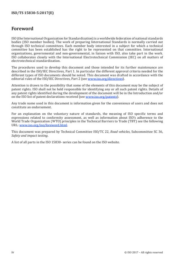 ISO/TS 15830-5:2017 is a technical specification published by the International Organization for Standardization (ISO). Its full title is "Road vehicles — Design and performance specifications for the WorldSID 50th percentile male side-impact dummy — Part 5: Dummy design updates". This standard covers: ISO/TS 15830-5:2017 specifies requirements and other design information which became available since 2013 for the WorldSID 50th percentile side-impact dummy, a standardized anthropomorphic dummy for side-impact tests of road vehicles. It is applicable to impact tests involving: - passenger vehicles of category M1 and goods vehicles of category N1; - impacts to the side of the vehicle structure; and - impact tests involving use of an anthropomorphic dummy as a human surrogate for the purpose of evaluating compliance with vehicle safety standards.