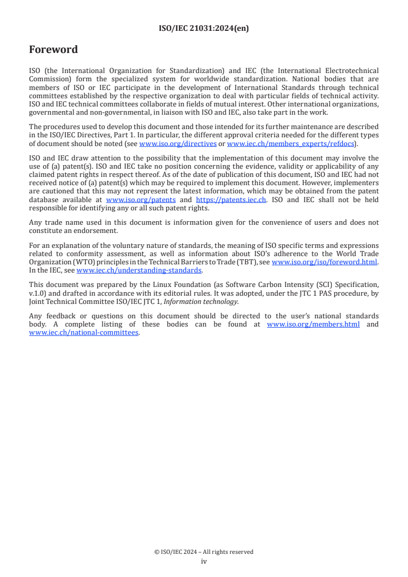 ISO/IEC 21031:2024 is a standard published by the International Organization for Standardization (ISO). Its full title is "Information technology - Software Carbon Intensity (SCI) specification". This standard covers: This document describes a methodology for calculating the rate of carbon emissions for a software system; that is, its SCI score. The purpose of this score is to increase awareness and transparency of an application's sustainability credentials. The score will help software practitioners make better, evidence-based decisions during system design, development, and deployment, that will ultimately minimize carbon emissions. A reliable, consistent, fair and comparable measure allows targets to be defined during development and progress to be tracked.