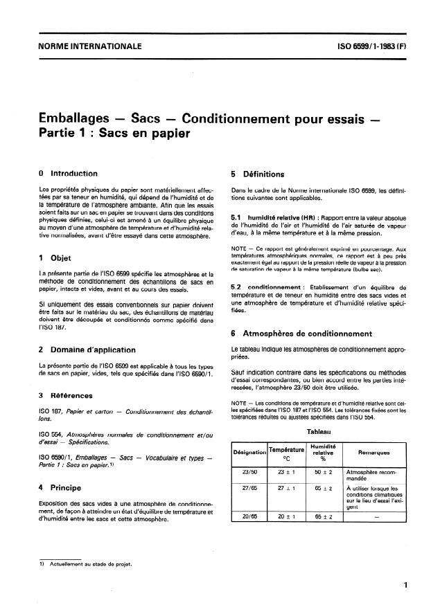 Keywords: ISO 6599-1:1983, paper sacks, conditioning for testing, conditioning atmospheres, packaging standards, humidity equilibrium, temperature control, packaging testing.