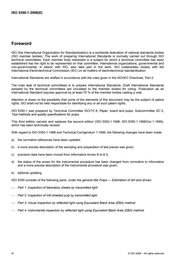 ISO 5350-1:2006 specifies a method for the estimation by transmitted light of the visible dirt and shives in laboratory sheets prepared from pulp. It is, in principle, applicable to all kinds of pulp, although it is mainly intended for pulp that is not manufactured in sheet form. ISO 5350-1:2006 can also be applied to mill sheeted pulp, if the sheets have high grammage or are very opaque for other reasons, in which case ISO 5350-2:2006 is not applicable. ISO 5350-1:2006 is not intended for recycled pulp.