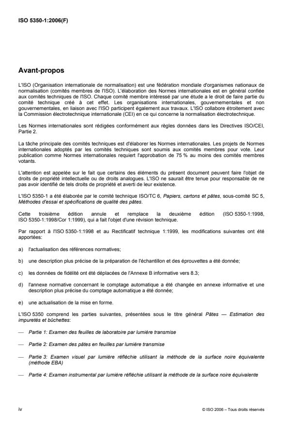 L'ISO 5350-1:2006 spécifie une méthode pour l'estimation par lumière transmise des impuretés et bûchettes visibles dans des feuilles de laboratoire préparées à partir de pâtes. En principe, elle est applicable à tous les types de pâte bien qu'elle soit principalement destinée aux pâtes qui ne sont pas fabriquées en feuilles. L'ISO 5350-1:2006 est également applicable aux pâtes fabriquées en feuilles si les feuilles ont un grammage élevé ou sont très opaques pour d'autres raisons, auquel cas l'ISO 5350-2 ne s'applique pas. L'ISO 5350-1:2006 n'est pas destinée aux pâtes recyclées.