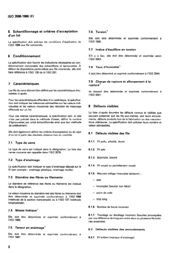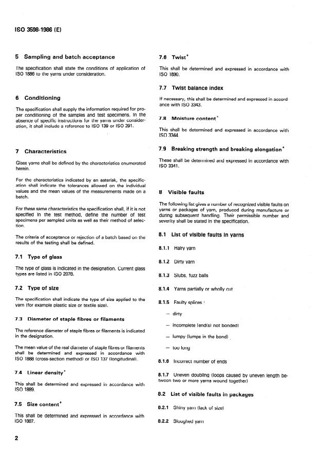 ISO 3598:1986 is a standard published by the International Organization for Standardization (ISO). Its full title is "Textile glass — Yarns — Basis for a specification". This standard covers: Provides a basis for the establishment of technical specifications for textile glass yarns (strands, slivers, single yarns, folded yarns and cable yarns) such specifications shall contain the following items: designation, sampling, type of glass, type of size, linear density, size content, twist, moisture content, breaking strength, permissible faults, delivery and storage conditions.