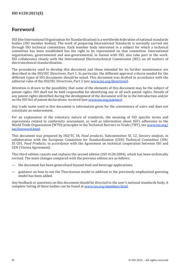 ISO 4120:2021 is a standard published by the International Organization for Standardization (ISO). Its full title is "Sensory analysis — Methodology — Triangle test". This standard covers: This document specifies a procedure for determining whether a perceptible sensory difference or similarity exists between samples of two products. The method is a forced-choice procedure. The method is applicable whether a difference exists in a single sensory attribute or in several attributes. The method is statistically more efficient than the duo-trio test (described in ISO 10399), but has limited use with products that exhibit strong carryover and/or lingering flavours. The method is applicable even when the nature of the difference is unknown [i.e. it determines neither the size nor the direction of difference between samples, nor is there any indication of the attribute(s) responsible for the difference]. The method is applicable only if the products are homogeneous. The method is effective for: a) determining that: either a perceptible difference results (triangle testing for difference); a perceptible difference does not result (triangle testing for similarity), when, for example, a change is made in ingredients, processing, packaging, handling or storage; b) selecting, training and monitoring assessors.
