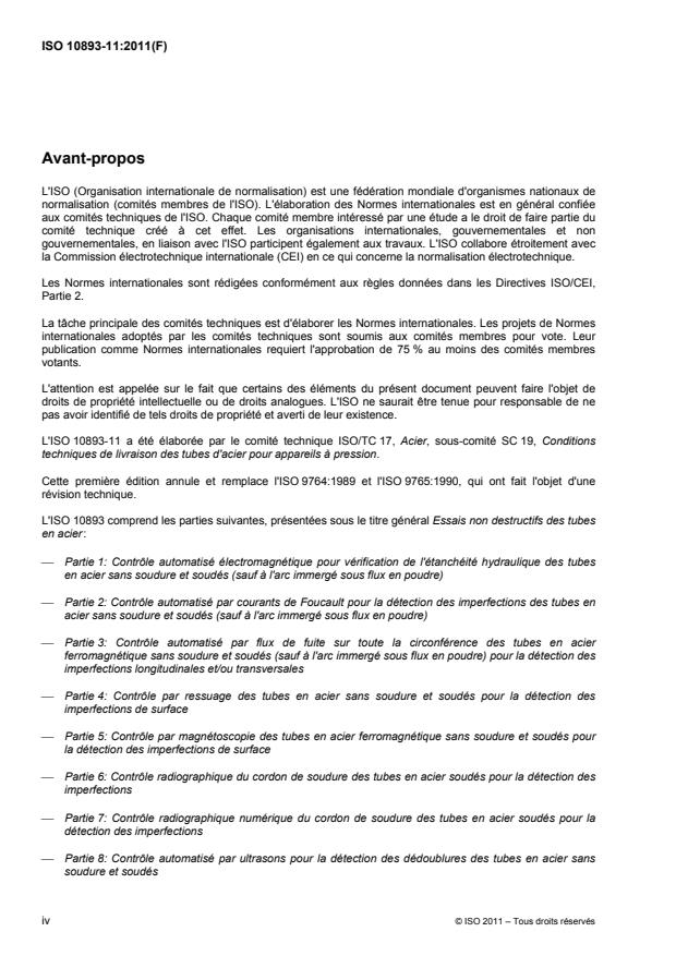 L'ISO 10893-11:2011 spécifie les exigences relatives au contrôle par ultrasons, avec ondes de cisaillement (générées par une technique conventionnelle ou la technique des réseaux à commande de phase), du cordon de soudure des tubes en acier soudés à l'arc immergé sous flux en poudre (SAW) ou des tubes en acier soudés par résistance électrique ou induction (EW). Pour les tubes SAW, le contrôle couvre la détection des imperfections principalement orientées parallèlement et/ou, par accord, perpendiculairement au cordon de soudure. Pour les tubes EW, le contrôle couvre la détection des imperfections principalement orientées parallèlement au cordon de soudure. Dans le cas de contrôle des imperfections longitudinales, un contrôle par ondes de Lamb peut être utilisé au choix du producteur. L'ISO 10893-11:2011 est également applicable au contrôle des profils creux circulaires.