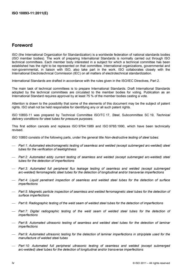 ISO 10893-11:2011 is a standard published by the International Organization for Standardization (ISO). Its full title is "Non-destructive testing of steel tubes - Part 11: Automated ultrasonic testing of the weld seam of welded steel tubes for the detection of longitudinal and/or transverse imperfections". This standard covers: ISO 10893-11:2011 specifies requirements for the automated ultrasonic shear wave (generated by conventional or phased array technique) testing of the weld seam of submerged arc-welded (SAW) or electric resistance and induction-welded (EW) steel tubes. For SAW tubes, the test covers the detection of imperfections oriented predominantly parallel to or, by agreement, perpendicular to the weld seam or both. For EW tubes, the test covers the detection of imperfections oriented predominantly parallel to the weld seam. In the case of testing on longitudinal imperfections, Lamb wave testing can be applied at the discretion of the manufacturer. ISO 10893-11:2011 can also be applicable to the testing of circular hollow sections.