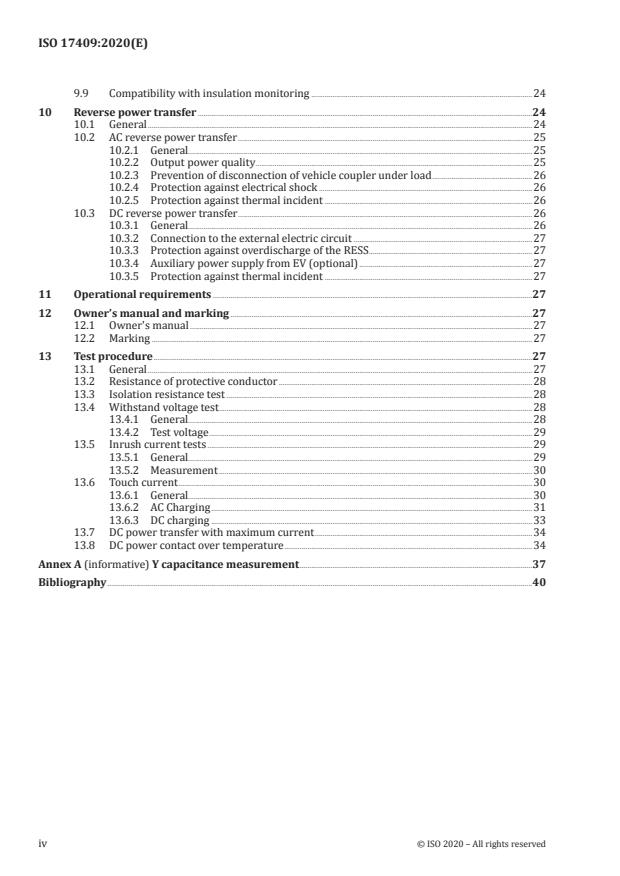 ISO 17409:2020 is a standard published by the International Organization for Standardization (ISO). Its full title is "Electrically propelled road vehicles — Conductive power transfer — Safety requirements". This standard covers: This document specifies electric safety requirements for conductive connection of electrically propelled road vehicles to external electric circuits. External electric circuits include external electric power supplies and external electric loads. This document provides requirements for the charging modes 2, 3, 4, as defined in IEC 61851-1, and reverse power transfer. For mode 4, this document provides requirements regarding the connection to an isolated DC EV charging station according to IEC 61851-23. NOTE 1 This edition does not provide requirements for mode 1. NOTE 2 External electric circuits are not part of the vehicle. This document applies to the on-board sections of vehicle power supply circuits. It applies also to dedicated power supply control functions used for the connection of the vehicle to an external electric circuit. It does not provide comprehensive safety information for manufacturing, maintenance and repair personnel. NOTE 3 ISO 6469-3 provides general electrical safety requirements for electrically propelled road vehicles. NOTE 4 With this edition of this document the limitation of y-capacitance for protection against electric shock under single failure conditions is no longer applicable as a fault protection provision when the vehicle has a conductive DC connection to an external electric circuit.