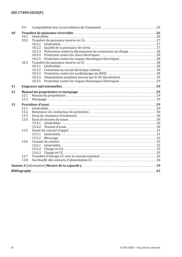 Le présent document spécifie les exigences de sécurité électrique relatives à la connexion par conduction des véhicules routiers à propulsion électrique à des circuits électriques externes. Les circuits électriques externes englobent les sources d'alimentation électrique externes et les charges électriques externes. Le présent document définit les exigences pour la recharge des modes 2, 3 et 4, tel que défini dans l'IEC 61851‑1, et pour le transfert de puissance réversible. Pour le mode 4, le présent document fournit les exigences concernant la connexion à une borne de charge CC isolée, conformément à l'IEC 61851‑23. NOTE 1 Cette édition ne définit pas les exigences relatives au mode 1. NOTE 2 Les circuits électriques extérieurs ne font pas partie du véhicule. Le présent document s'applique aux parties embarquées des circuits d'alimentation des véhicules. Elle s'applique également aux fonctions dédiées de contrôle de l'alimentation électrique utilisées pour la connexion du véhicule à un circuit électrique externe. Le présent document ne fournit pas d'informations complètes concernant la sécurité pour le personnel de fabrication, de maintenance et de réparation. NOTE 3 L'ISO 6469‑3 fournit les exigences générales de sécurité électrique pour les véhicules routiers à propulsion électrique. NOTE 4 Avec l'édition du présent document, la limitation de la capacité y pour la protection contre les chocs électriques dans des conditions de défaillance unique ne s'applique plus en tant que disposition de protection contre les défaillances, lorsque le véhicule dispose d'une connexion par conduction en courant continu avec un circuit électrique externe.