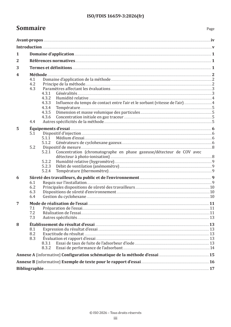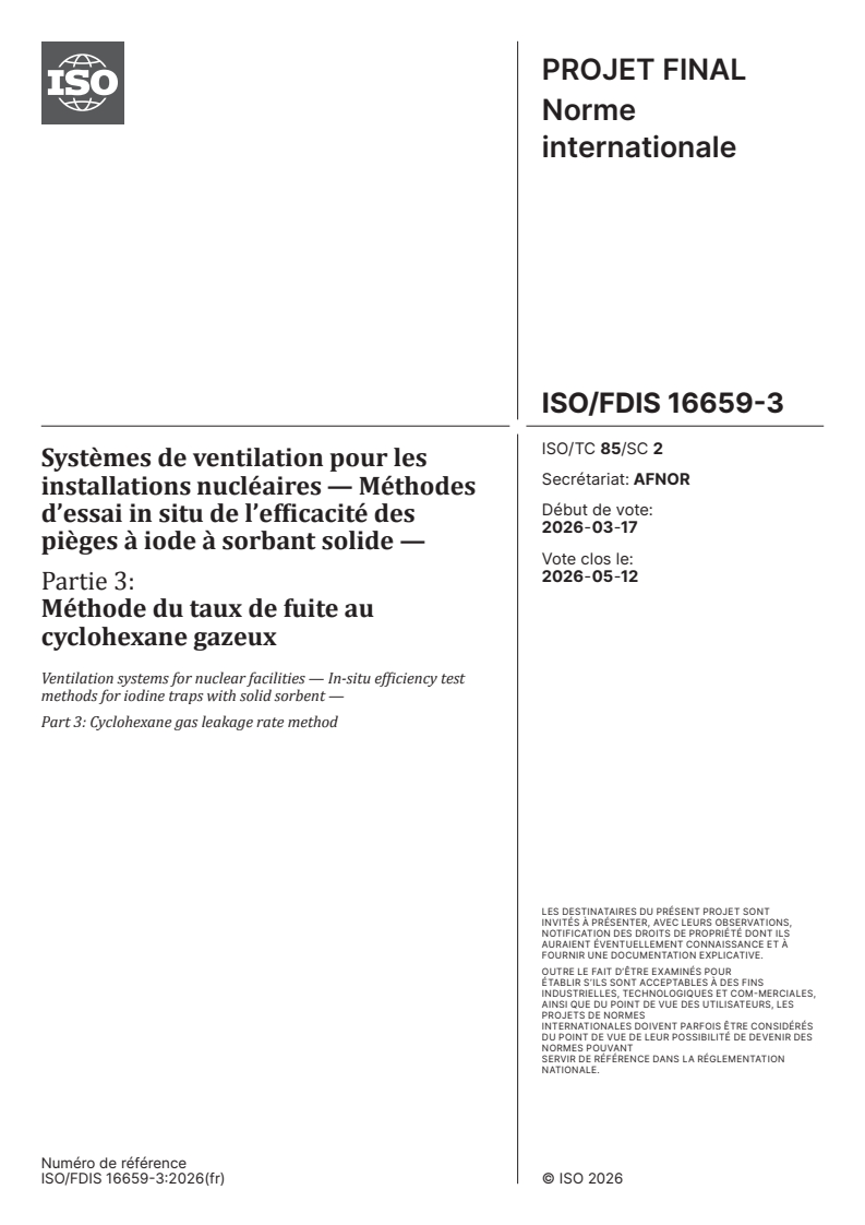 ISO/FDIS 16659-3 - Systèmes de ventilation pour les installations nucléaires — Méthodes d’essai in situ de l’efficacité des pièges à iode à sorbant solide — Partie 3: Méthode du débit de fuite au cyclohexane gazeux/24/2025