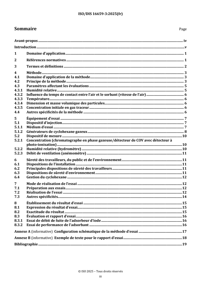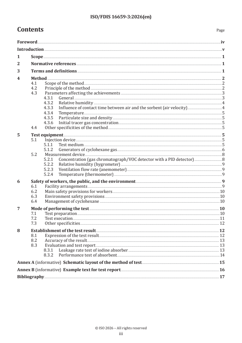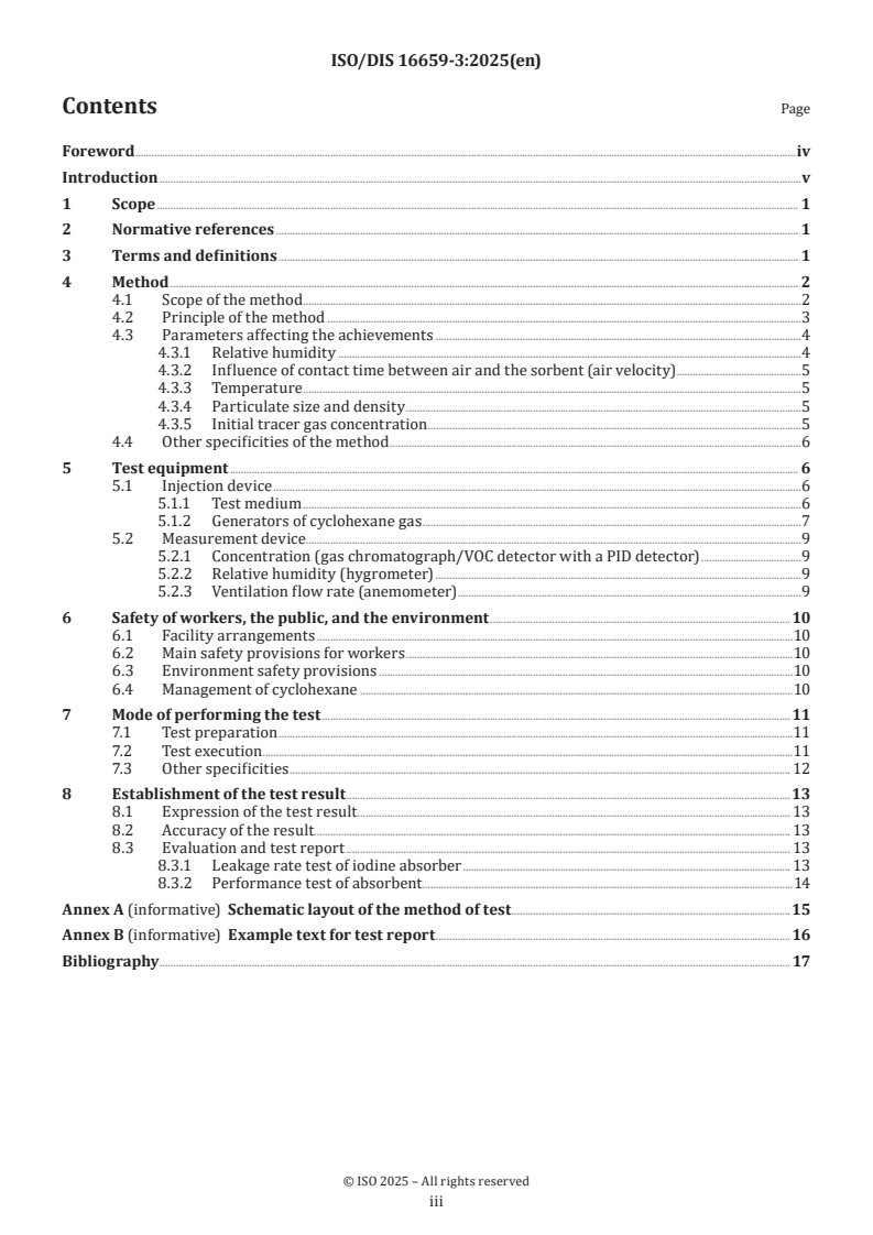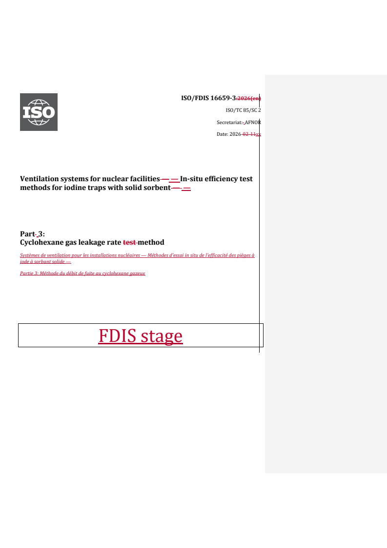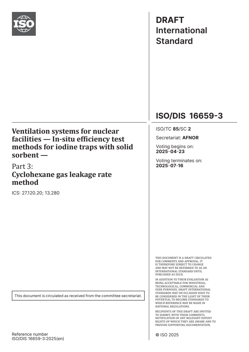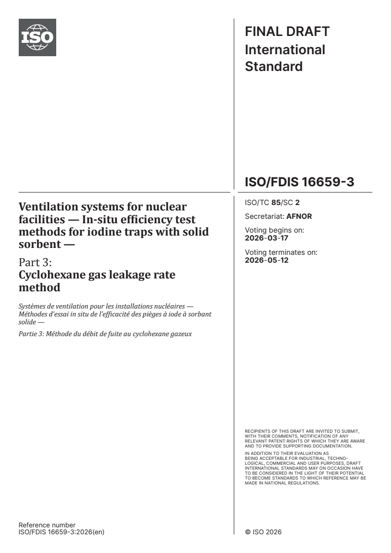 ISO/FDIS 16659-3 - Ventilation systems for nuclear facilities — In-situ efficiency test methods for iodine traps with solid sorbent — Part 3: Cyclohexane gas leakage rate method/26/2025