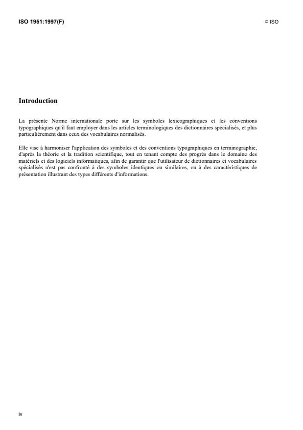 ISO 1951:1997 is a standard published by the International Organization for Standardization (ISO). Its full title is "Lexicographical symbols and typographical conventions for use in terminography". This standard covers: La présente Norme internationale prescrit les symboles lexicographiques et les conventions typographiques à utiliser dans les ouvrages suivants : -- dictionnaires spécialisés, -- lexiques spécialisés, -- vocabulaires systématiques, -- vocabulaires alphabétiques, -- bases de données terminologiques, -- banques de données terminologiques, -- travaux se rapportant à la lexicographie et à la documentation. Elle ne traite pas des règles à suivre pour la préparation et la présentation des Normes internationales terminologiques, qui sont énoncées dans l'ISO 10241.