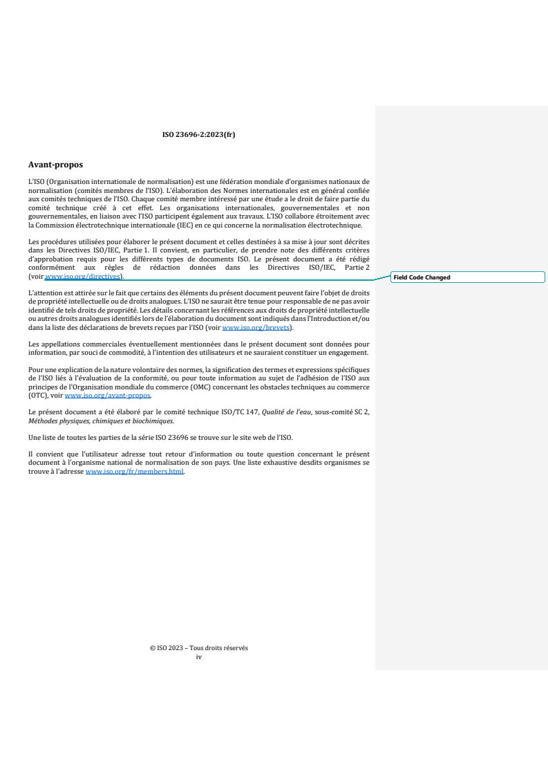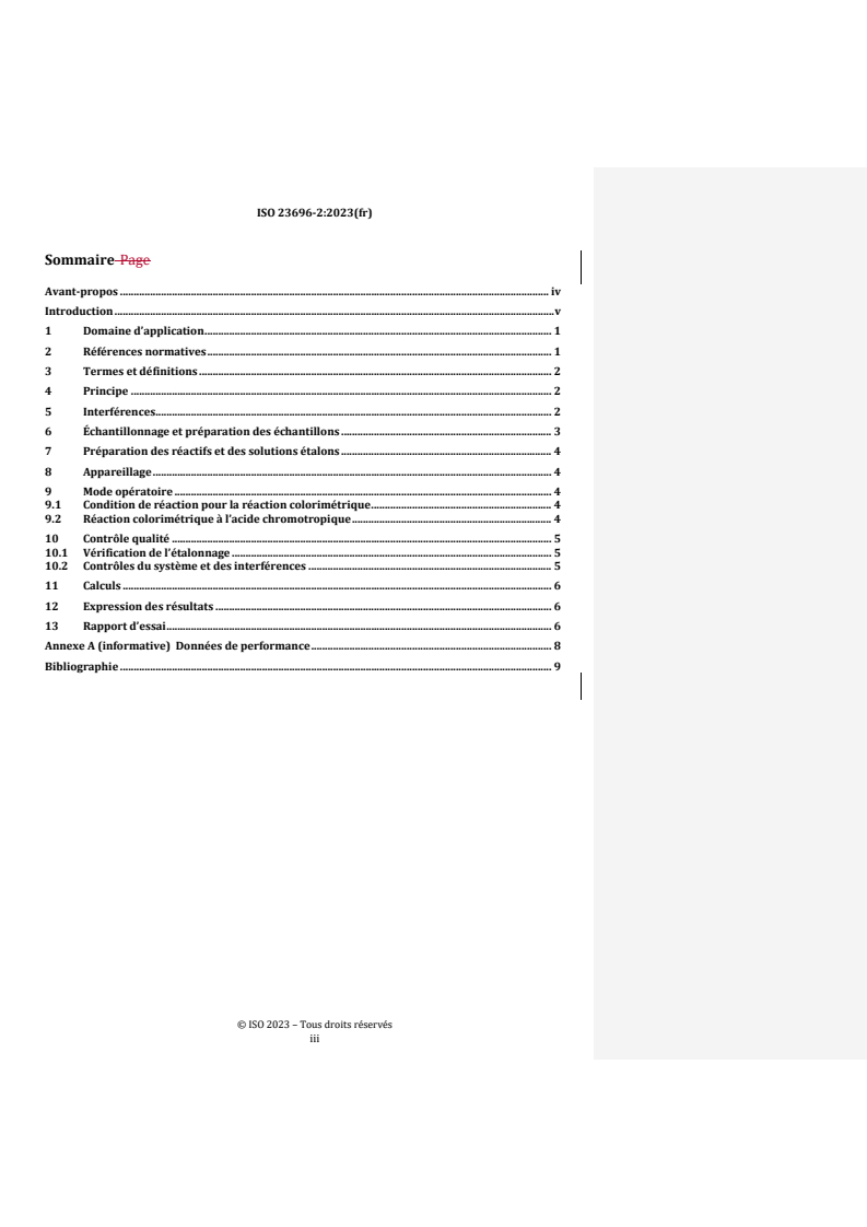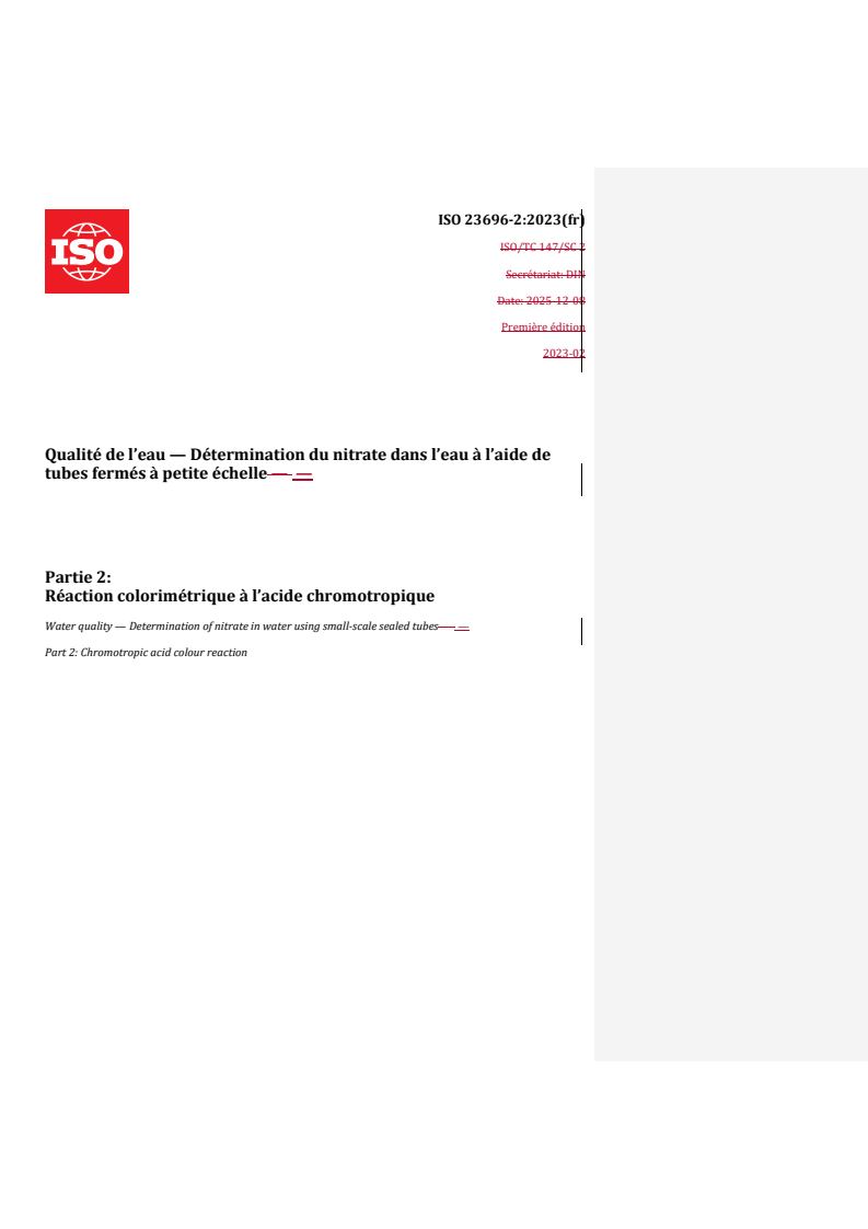 REDLINE ISO 23696-2:2023 - Qualité de l’eau — Détermination du nitrate dans l’eau à l’aide de tubes fermés à petite échelle — Partie 2: Réaction colorimétrique à l’acide chromotropique Released:2/12/2026