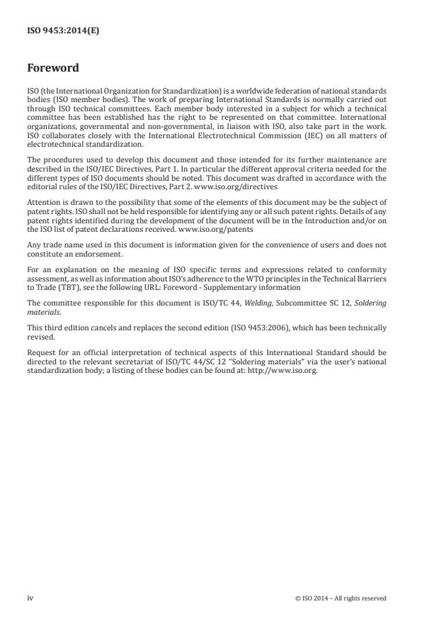 ISO 9453:2014 is a standard published by the International Organization for Standardization (ISO). Its full title is "Soft solder alloys — Chemical compositions and forms". This standard covers: ISO 9453:2014 specifies the requirements for chemical composition for soft solder alloys containing two or more of tin, lead, antimony, copper, silver, bismuth, zinc, indium and/or cadmium.