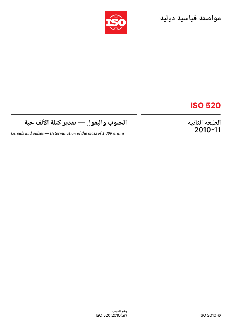 ISO 520:2010 - Cereals and pulses — Determination of the mass of 1 000 grains Released:12/13/2012