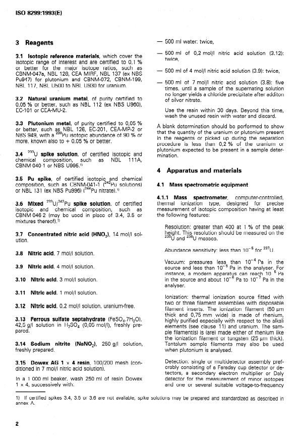 ISO 8299:1993 is a standard published by the International Organization for Standardization (ISO). Its full title is "Determination of isotopic content and concentration of uranium and plutonium in nitric acid solution — Mass spectrometric method". This standard covers: The method is based on isotope ratio measurements in solutions by thermal ionization mass spectrometry. Includes the following steps: dilution, spike addition, isotope exchange chemistry, ion exchange purification/separation, preparation of filaments, mass spectrometric measurements and calculation of isotopic and elemental concentrations. Pu 238 is determined by means of alpha spectrometry if interferences from U 238 cannot be eliminated. Is applicable to solutions of irradiated fuels from boiling water or pressurized water reactors and, after modification of chemical separation and spike solution, also to other types of fuel.