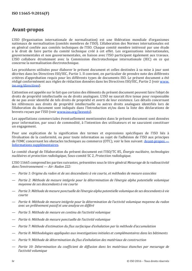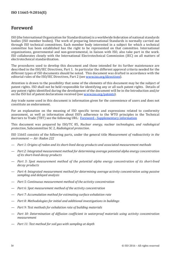 ISO 11665-9:2016 is a standard published by the International Organization for Standardization (ISO). Its full title is "Measurement of radioactivity in the environment — Air: Radon-222 — Part 9: Test methods for exhalation rate of building materials". This standard covers: ISO 11665-9:2016 specifies a method for the determination of the free radon exhalation rate of a batch of mineral based building materials. The standard only refers to 222Rn exhalation determination using two test methods: Liquid Scintillation Counting (LSC) and gamma ray spectrometry (Annex A and Annex B) The exhalation of thoron (220Rn) does not affect the test result when applying the determination methods described in this part of the standard.