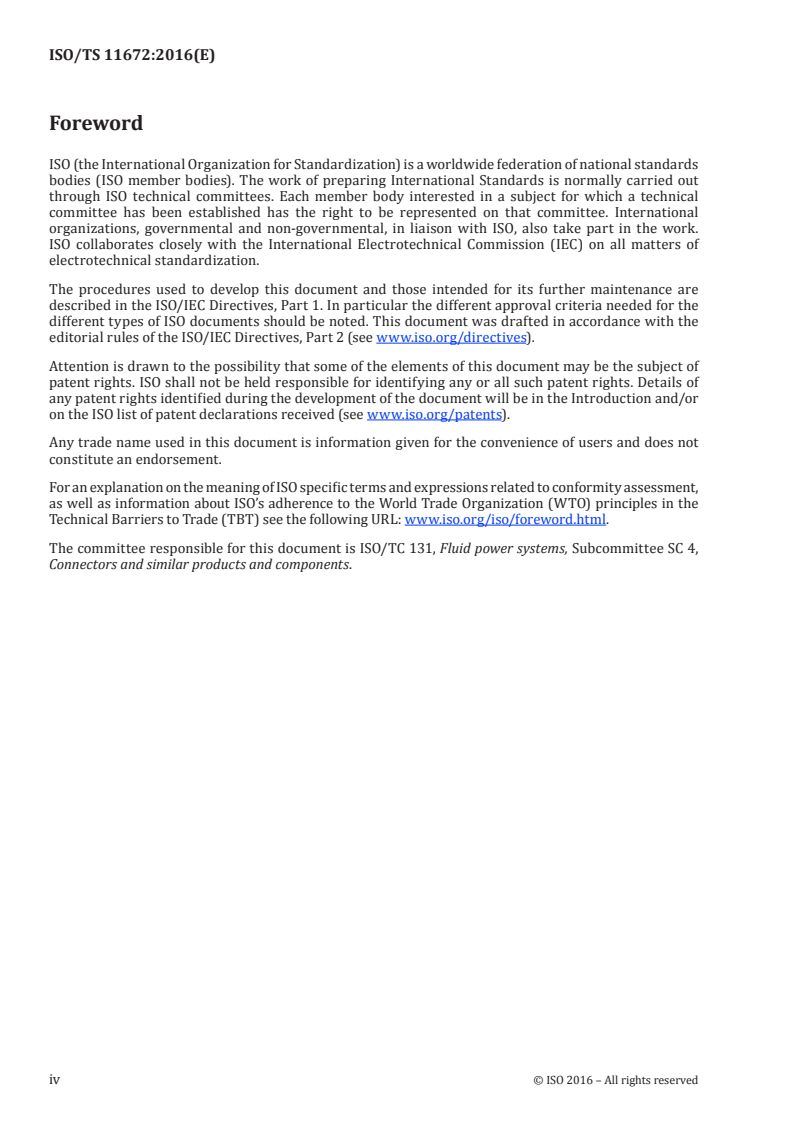 ISO/TS 11672:2016 is a technical specification published by the International Organization for Standardization (ISO). Its full title is "Connectors for fluid power and general use - Designation and nomenclature". This standard covers: ISO/TS 11672:2016 collects the various designation and nomenclature schemes specified in International Standards for connectors and similar products standardized by ISO/TC 131/SC 4. It establishes a uniform nomenclature structure to facilitate standardization of product names used for threaded connectors, push-in connectors, flanges, hose fittings, port plugs and quick-action couplings. The designation and nomenclature established in this document are applicable for procurement purposes when agreed to by user and supplier.