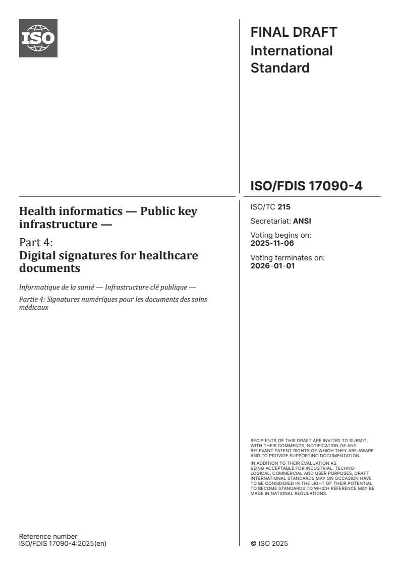 ISO/FDIS 17090-4 - Health informatics — Public key infrastructure — Part 4: Digital signatures for healthcare documents Released:23. 10. 2025