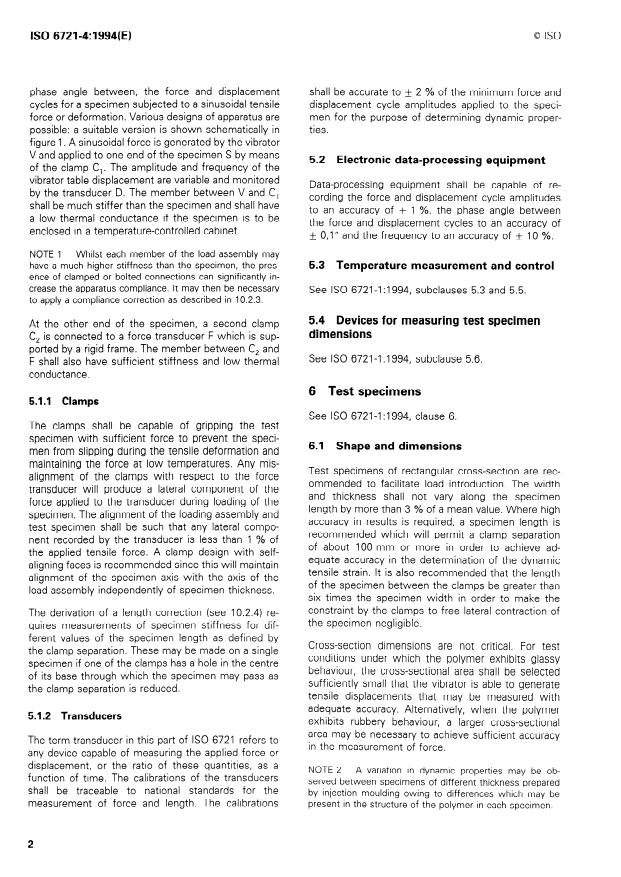 ISO 6721-4:1994 is a standard published by the International Organization for Standardization (ISO). Its full title is "Plastics — Determination of dynamic mechanical properties — Part 4: Tensile vibration — Non-resonance method". This standard covers: Describes a forced, nonresonance method for determining the components of the tensile complex modulus of polymers at frequencies typically in the range 0,01 Hz to 100 Hz. The method is suitable for measuring dynamic storage moduli in the range 0,01 GPa to 5 GPa and to the measurement of loss factors greater than 0,1 und may therefore be conveniently used to study the variation of dynamic properties with temperature and frequency through most of the glass-rubber relaxation region.