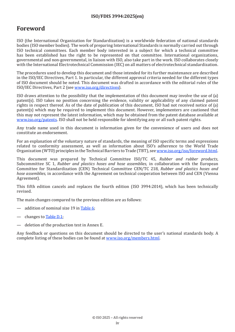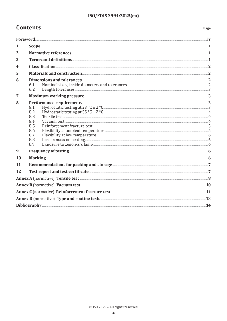 ISO/FDIS 3994 (ISO 3994:2025) specifies requirements for helical‑thermoplastic‑reinforced thermoplastic hoses intended for the suction and discharge of aqueous materials, including water, weak aqueous chemical solutions and abrasive solids/slurries. The standard covers three duty classes - type 1 (light), type 2 (medium) and type 3 (heavy) - and applies to ambient service temperatures from −10 °C to 55 °C. It excludes use with flammable/combustible materials and aromatic solvents.