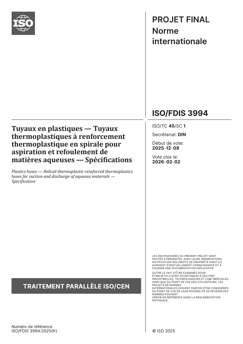 ISO/FDIS 3994 - Plastics hoses — Helical-thermoplastic-reinforced thermoplastics hoses for suction and discharge of aqueous materials — Specification Released:11/24/2025