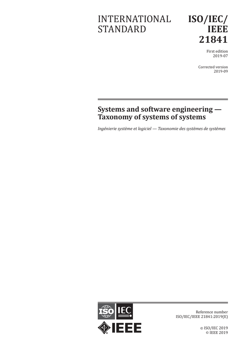 ISO/IEC/IEEE 21841:2019 - Systems and software engineering — Taxonomy of systems of systems Released:9/6/2019
