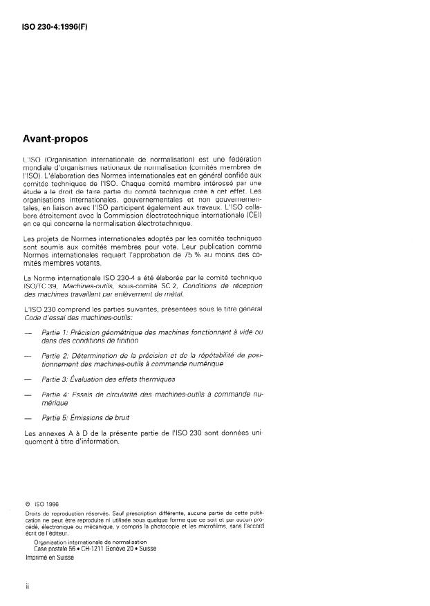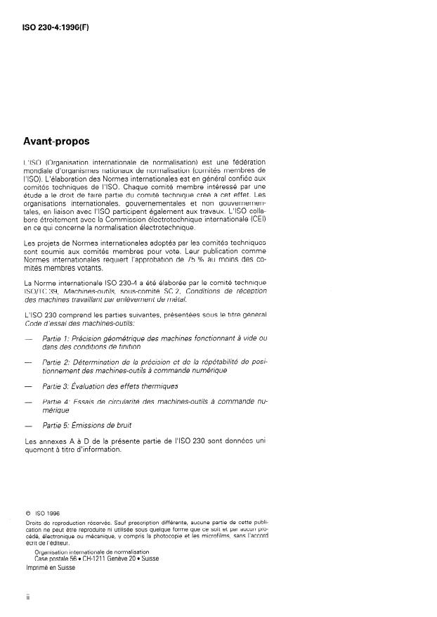 ISO 230-4:1996 is a standard published by the International Organization for Standardization (ISO). Its full title is "Test code for machine tools — Part 4: Circular tests for numerically controlled machine tools". This standard covers: La présente partie de l'ISO 230 prescrit les méthodes d'essai et d'évaluation de l'hystérésis circulaire et de l'écart de circularité et de l'écart radial des trajectoires circulaires effectuées grâce aux mouvements simultanés de deux axes linéaires. Les instruments de mesure susceptibles d'être utilisés sont décrits en 6.63 de l'ISO 230-1:1996. La présente partie de l'ISO 230 a pour objectif de fournir une méthode de mesure des performances en contournage d'une machine-outil à commande numérique.