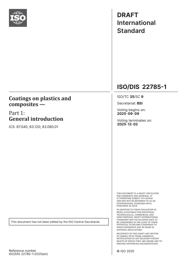 ISO/FDIS 22785-1 - Paints and varnishes — Coatings on plastics and composites — Part 1: General introduction/15/2025