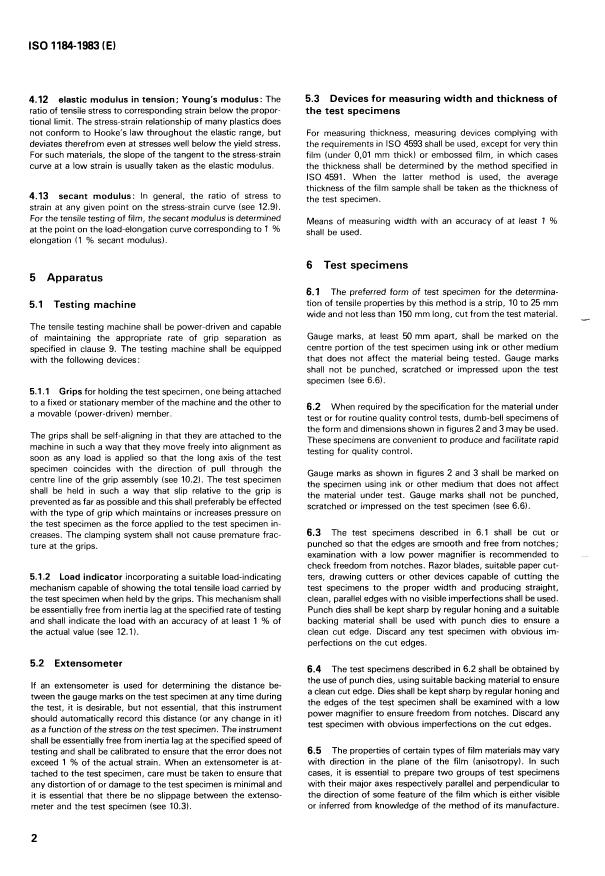 ISO 1184:1983 is a standard published by the International Organization for Standardization (ISO). Its full title is "Plastics — Determination of tensile properties of films". This standard covers: Plastics — Determination of tensile properties of films