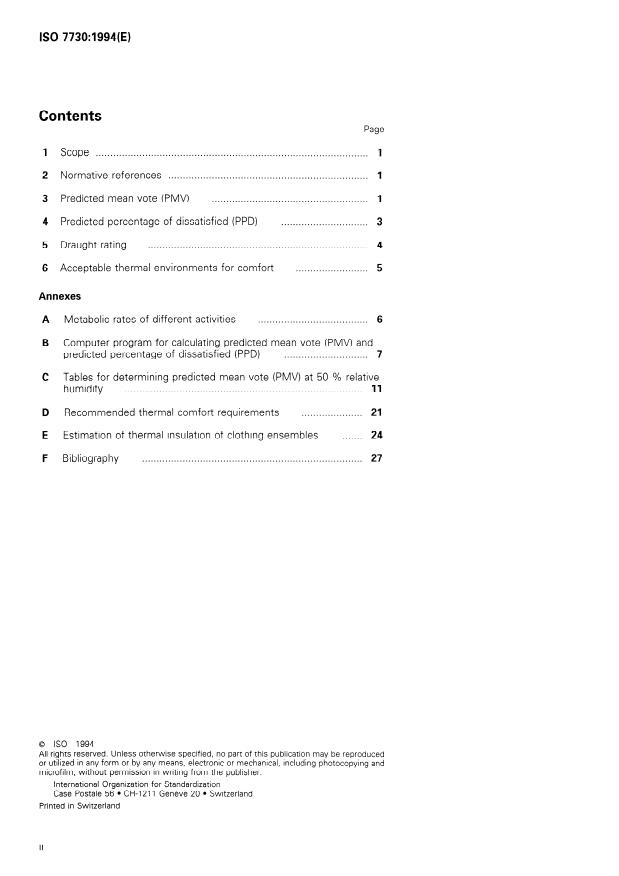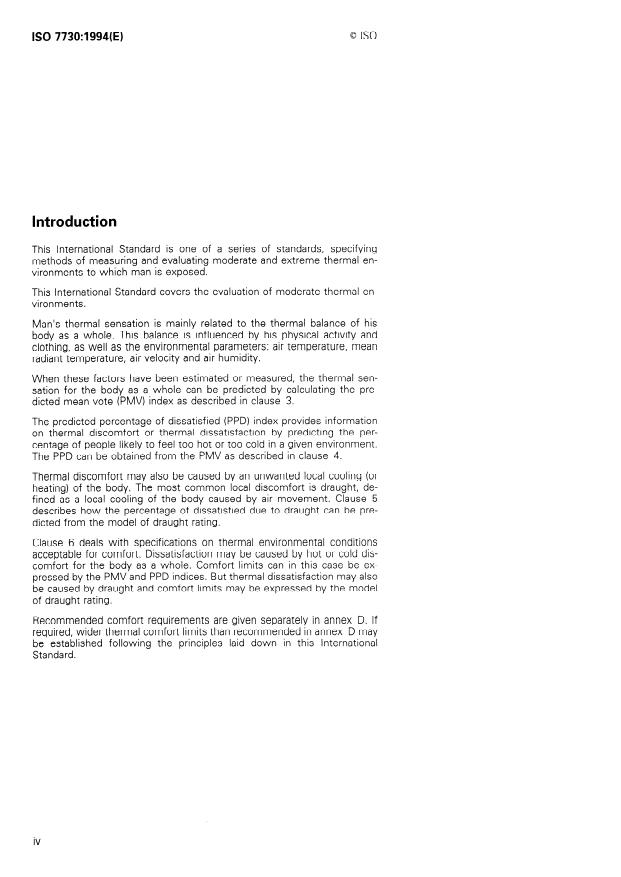 ISO 7730:1994 is a standard published by the International Organization for Standardization (ISO). Its full title is "Moderate thermal environments — Determination of the PMV and PPD indices and specification of the conditions for thermal comfort". This standard covers: The purpose is to present a method for predicting the thermal sensation and the degree of discomfort (thermal dissatisfaction) of people exposed to moderate thermal environments and to specify acceptable environmental conditions for comfort. Applies to healthy men and women and was originally based on studies of North American and European subjects but agrees also well with recent studies of Japanese subjects and is expected to apply with good approximation in most parts of the world. Applies to people exposed to indoor environments where the aim is to attain thermal comfort, or indoor environments where moderate deviations from comfort occur.