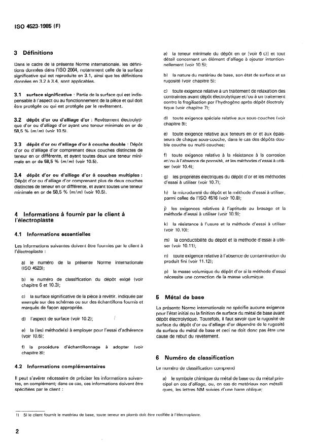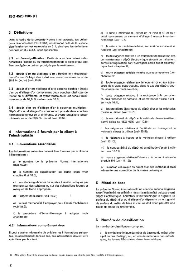 ISO 4523:1985 is a standard published by the International Organization for Standardization (ISO). Its full title is "Metallic coatings — Electrodeposited gold and gold alloy coatings for engineering purposes". This standard covers: La présente Norme internationale spécifie les exigences relatives aux dépôts électrolytiques (en couche unique, double ou multiple) d'or et d'alliages d'or, pour l'application dans les industries électriques, électroniques et autres sur les matériaux métalliques et non métalliques. Dans le cas de dépôts à couche double ou multiple (voir 10.1), les exigences d'épaisseur s'appliquent aux dépôts d'or dans leur ensemble, tandis que les exigences de teneur en or s'appliquent à chaque couche en particulier. Elle ne s'applique ni aux revêtements sur les filetages des vis [voir ISO 4042, Éléments filetés -- Revêtements électrolytiques (actuellement au stade de projet)] ni aux dépôts appliqués sur des tôles ou des bandes à l'état non usiné.