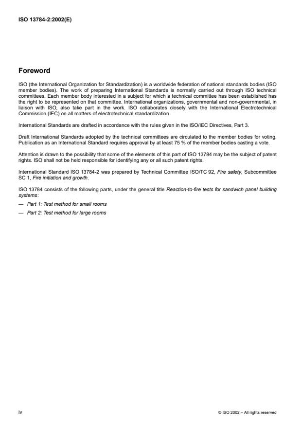 ISO 13784-2:2002 specifies a test method for determining the reaction to fire of sandwich panel building systems for large rooms and the resulting flame spread on or within the sandwich panel building construction when it is exposed to heat from a simulated internal fire with flames impinging directly on its internal corner. The test method is not intended for evaluating a product's fire resistance. ISO 13784-2:2002 is applicable to both freestanding and self-supporting, and frame-supported, sandwich panel systems, but only to wall and ceiling or roof constructions.