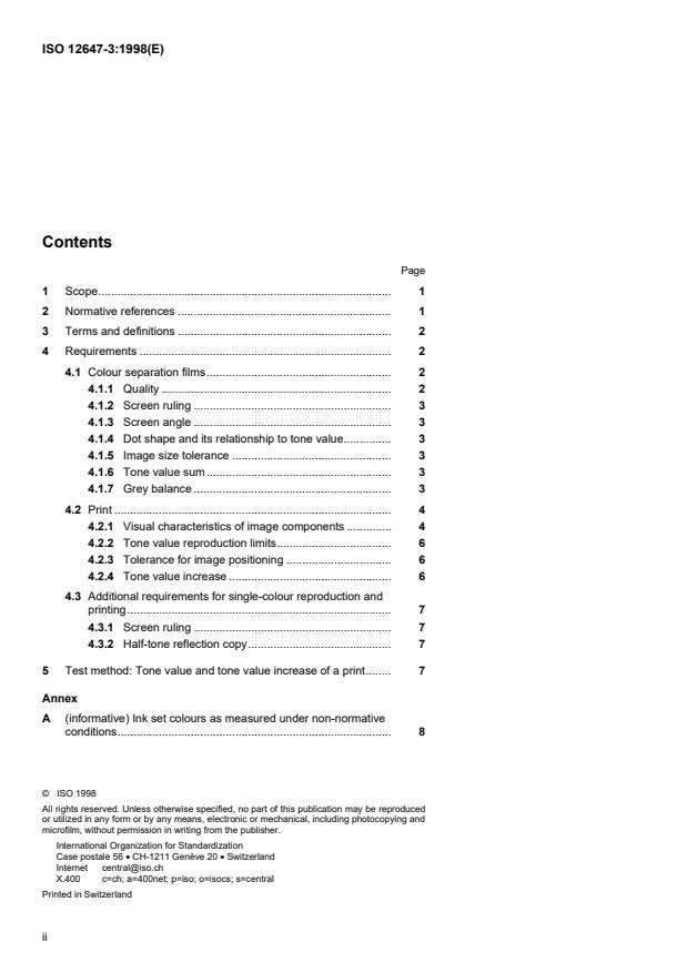 ISO 1998All rights reserved. Unless otherwise specified, no part of this publication may be reproducedor utilized in any form or by any means, electronic or mechanical, including photocopying andmicrofilm, without permission in writing from the publisher.International Organization for StandardizationCase postale 56 · CH-1211 Genève 20 · SwitzerlandInternetcentral@iso.chX.400c=ch; a=400net; p=iso; o=isocs; s=centralPrinted in SwitzerlandiiContentsPage1Scope.12Normative references.13Terms and definitions.24Requirements.24.1Colour separation films.24.1.1