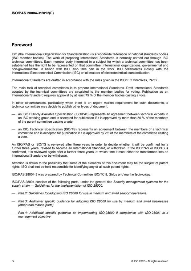 ISO/PAS 28004-3:2012 has been developed to supplement ISO 28004-1 by providing additional guidance to medium and small businesses (other than marine ports) that wish to adopt ISO 28000. The additional guidance in ISO/PAS 28004-3:2012, while amplifying the general guidance provided in the main body of ISO 28004-1, does not conflict with the general guidance, nor does it amend ISO 28000.