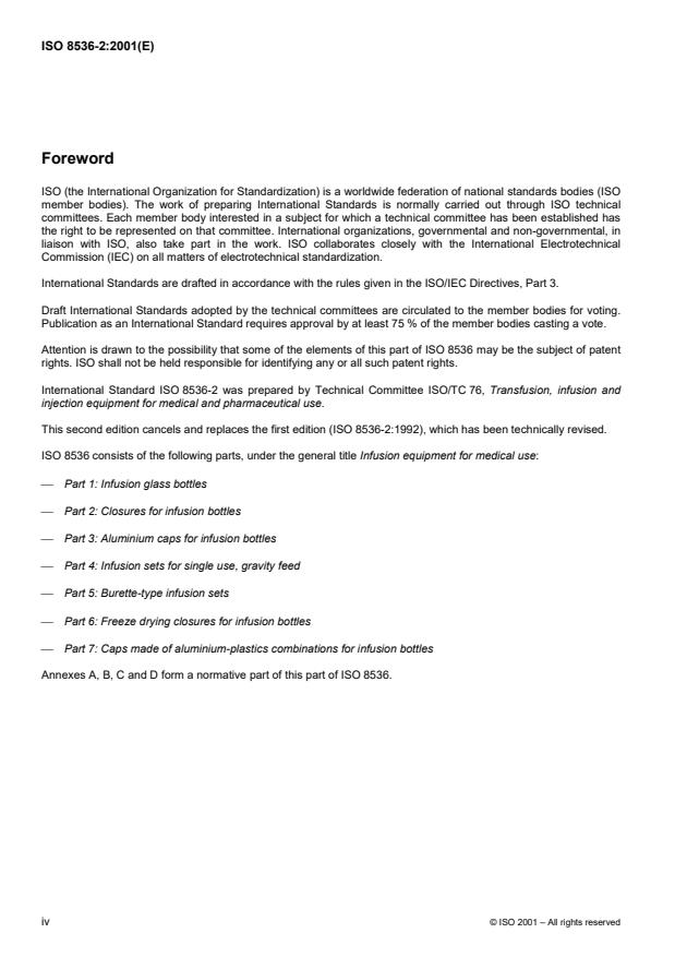 ISO 8536-2:2001 is a standard published by the International Organization for Standardization (ISO). Its full title is "Infusion equipment for medical use — Part 2: Closures for infusion bottles". This standard covers: Infusion equipment for medical use — Part 2: Closures for infusion bottles