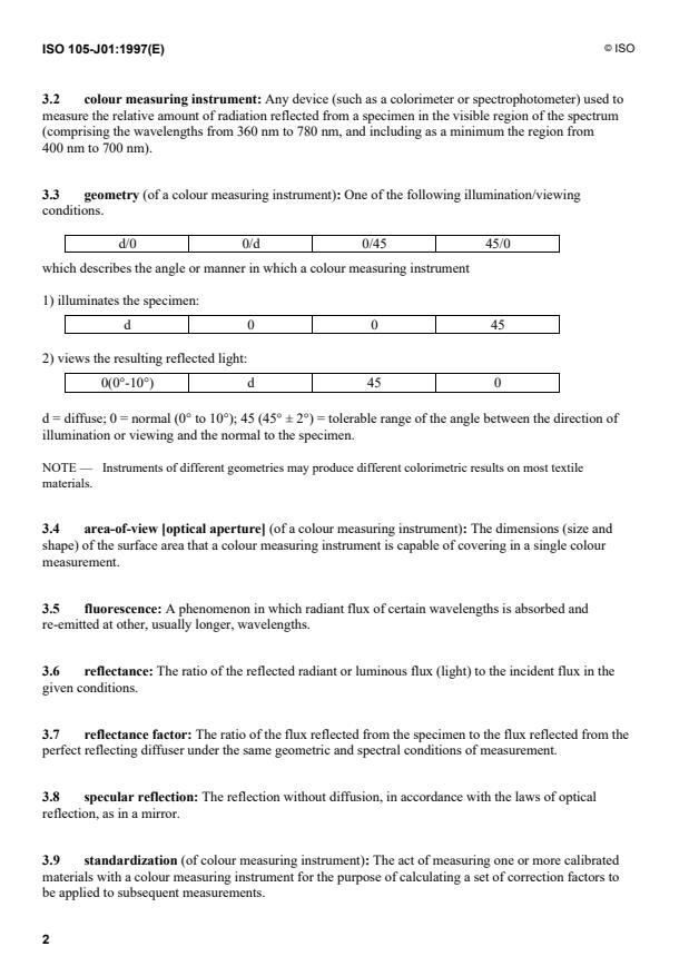 - Definitions: Key terms including reflectance, reflectance factor, specular reflection, area-of-view, fluorescence, and standardization.