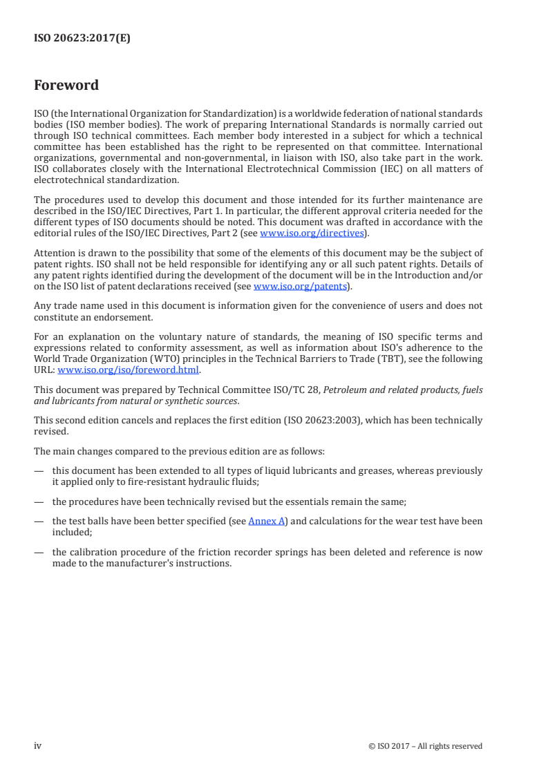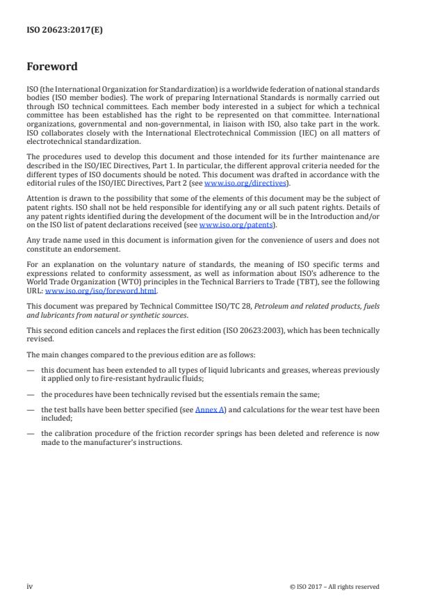 ISO 20623:2017 is a standard published by the International Organization for Standardization (ISO). Its full title is "Petroleum and related products — Determination of the extreme-pressure and anti-wear properties of lubricants — Four-ball method (European conditions)". This standard covers: ISO 20623:2017 specifies procedures for the measurement of the extreme pressure (EP) and anti-wear properties of liquid lubricants (categories C, D, F, G, H, M, P of ISO 6743‑99), lubricating greases (ISO 6743‑9, category X) and other consistent lubricants. The test conditions are not intended to simulate particular service conditions, but to provide information over a range of standard conditions for the purpose of research, development, quality control and fluid ranking. The output is used in lubricant specifications.