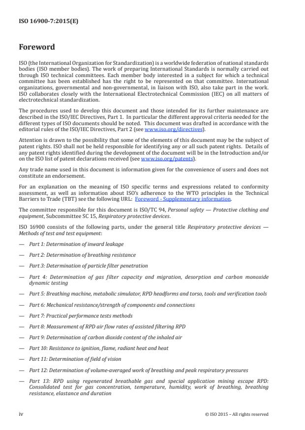 ISO 16900-7:2015 is a standard published by the International Organization for Standardization (ISO). Its full title is "Respiratory protective devices — Methods of test and test equipment — Part 7: Practical performance test methods". This standard covers: ISO 16900-7:2015 specifies practical performance tests for respiratory protective devices (RPD). The purpose of these tests is to subjectively assess certain properties, characteristics, and functions of the RPD when worn by test subjects in simulated practical use, which cannot be assessed by tests described in other standards.