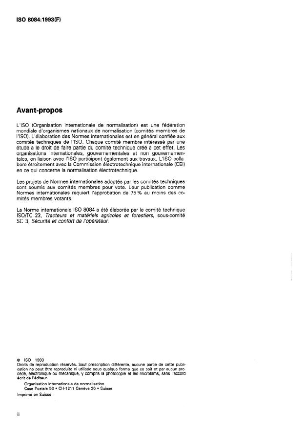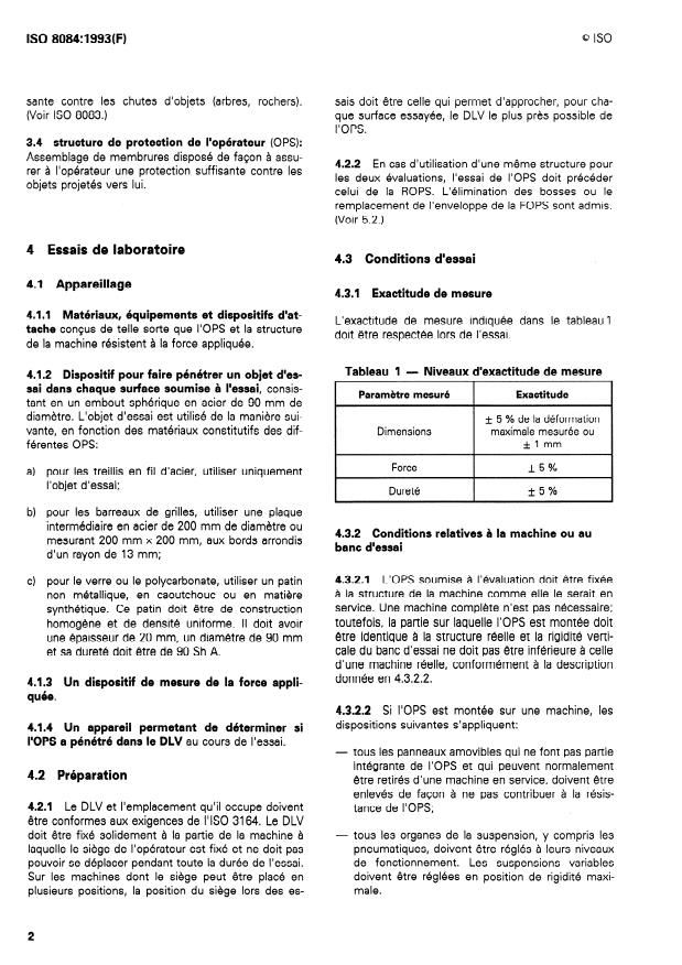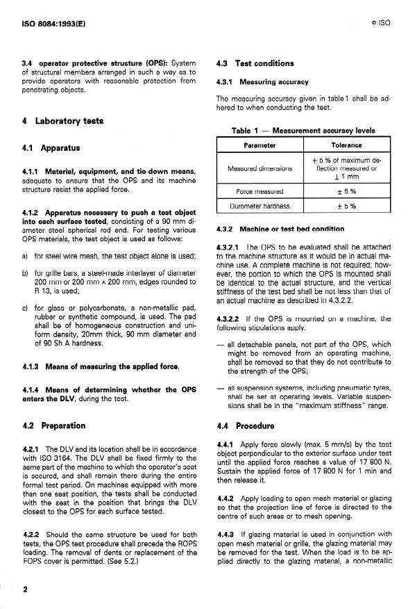 ISO 8084:1993 is a standard published by the International Organization for Standardization (ISO). Its full title is "Machinery for forestry — Operator protective structures — Laboratory tests and performance requirements". This standard covers: Establishes a consistent repeatable means of evaluating characteristics of an operator protective structure under loading, and prescribes performance requirements for this structure under such loading in a representative test. Applies to mobile forestry machines and equipment defined in ISO 6814.