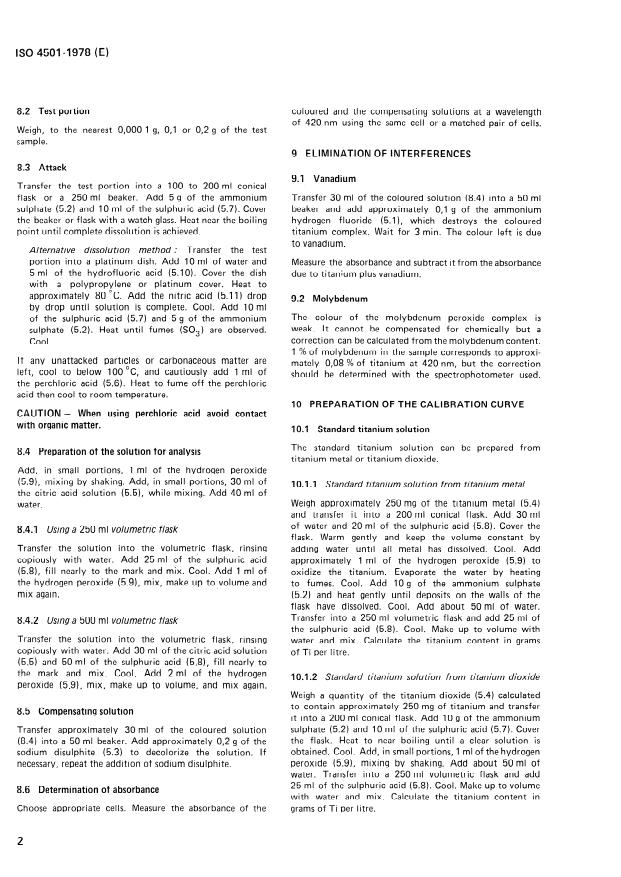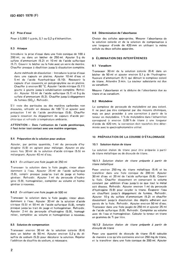 ISO 4501:1978 is a standard published by the International Organization for Standardization (ISO). Its full title is "Hardmetals - Determination of titanium - Photometric peroxide method". This standard covers: The method is applicable to carbide and binder metal powder mixtures, free of lubricant, and all grades of presintered or sintered hardmetals, with a titanium content exceeding 0,2 % (m/m). Specifies principle, interfering elements, reagents, apparatus, sample preparation, procedure, elimination of interferences, preparation of the calibration curve, expression of results and test report.